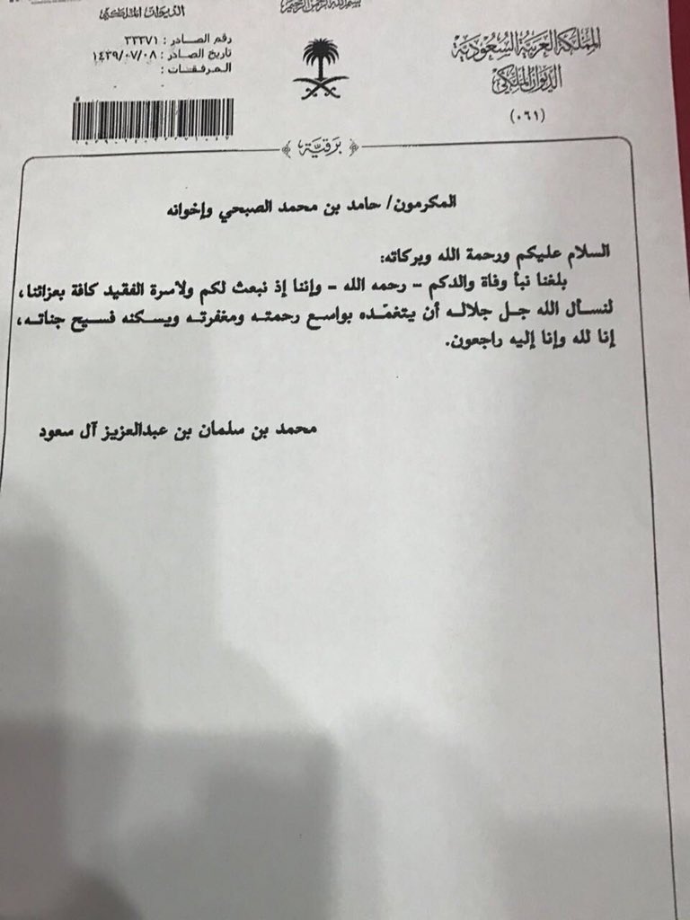 ديوان قبيلة صبح En Twitter ولي العهد الأمير محمد بن سلمان بن عبدالعزيز حفظه الله يبعث برقية تعزية ومواساة في وفاة الشيخ محمد صالح بن حصاني الصبجي لابنه الشيخ حامد بن حصاني