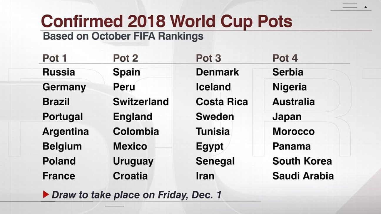 With peru completing the line up of 32 teams for the 2018 fifa world cup russia we now know the seeding pots for the final draw on 1 december.